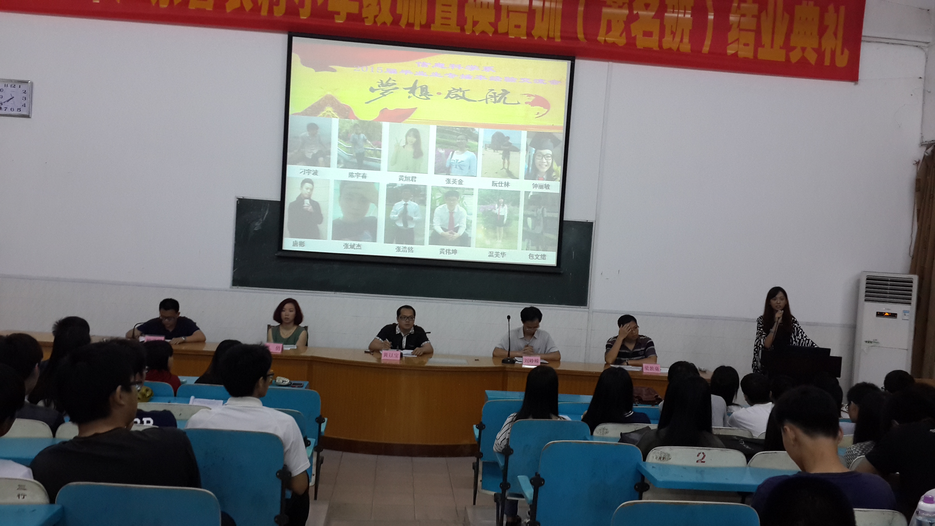 2015年4月23日晚上19:10,信息科学系在师训楼二楼阶梯室召开2015届毕业生专插本经验交流大会;参与本次会议人员有系黄以宝主任,刘峥嵘书记,辅导员周悄和梁敦毫老师,全系的班主任,2015届成功专插本上线的黄旭君、阮仕林、钟丽敏、温美华四位毕业生以及全系学生,会议由赖荣泽老师主持。