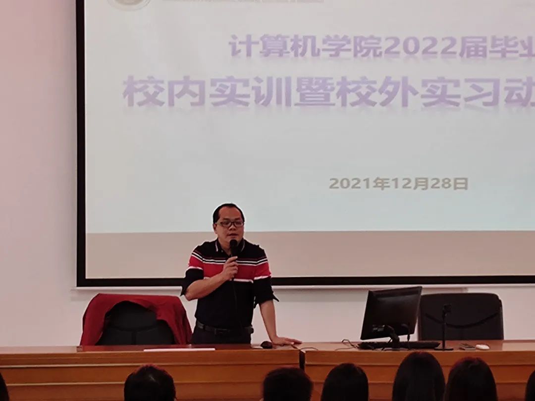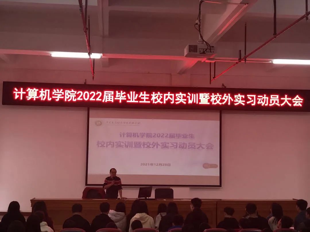 为进一步做好2022届毕业生实习工作,引导我院学子充分做好实习准备,推进实习工作的顺利完成,2021年12月28日下午,我院在学术报告厅召开了校内实训暨校外实习动员大会。院长黄以宝、辅导员张燕及319级全体毕业班学生参加本次大会,黄以宝主持。