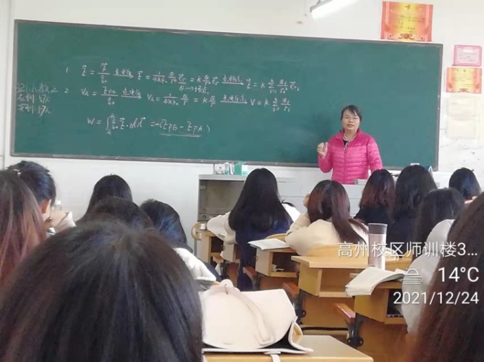 由陈文芳老师上公开课,科目是大学物理,内容为期末复习课,复习该学期所学过的公式,授课班级为319数教5班。听课环节已于12月24日周五上午第一节07:50-08:35在高州校区师训楼313室完成。
