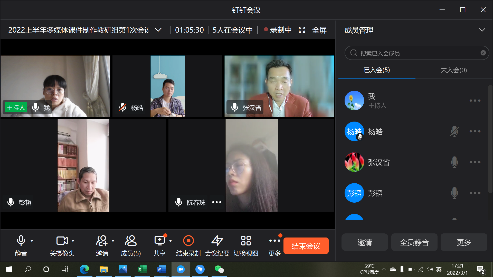 计算机学院多媒体课件制作教研组于2022年3月1日下午16:15~17:15在多媒体素材与课件制作钉钉群召开本学期第1次教研会,教研组全体成员参加了活动。本次教研活动有3项议程,由组长吴琼香老师主持。