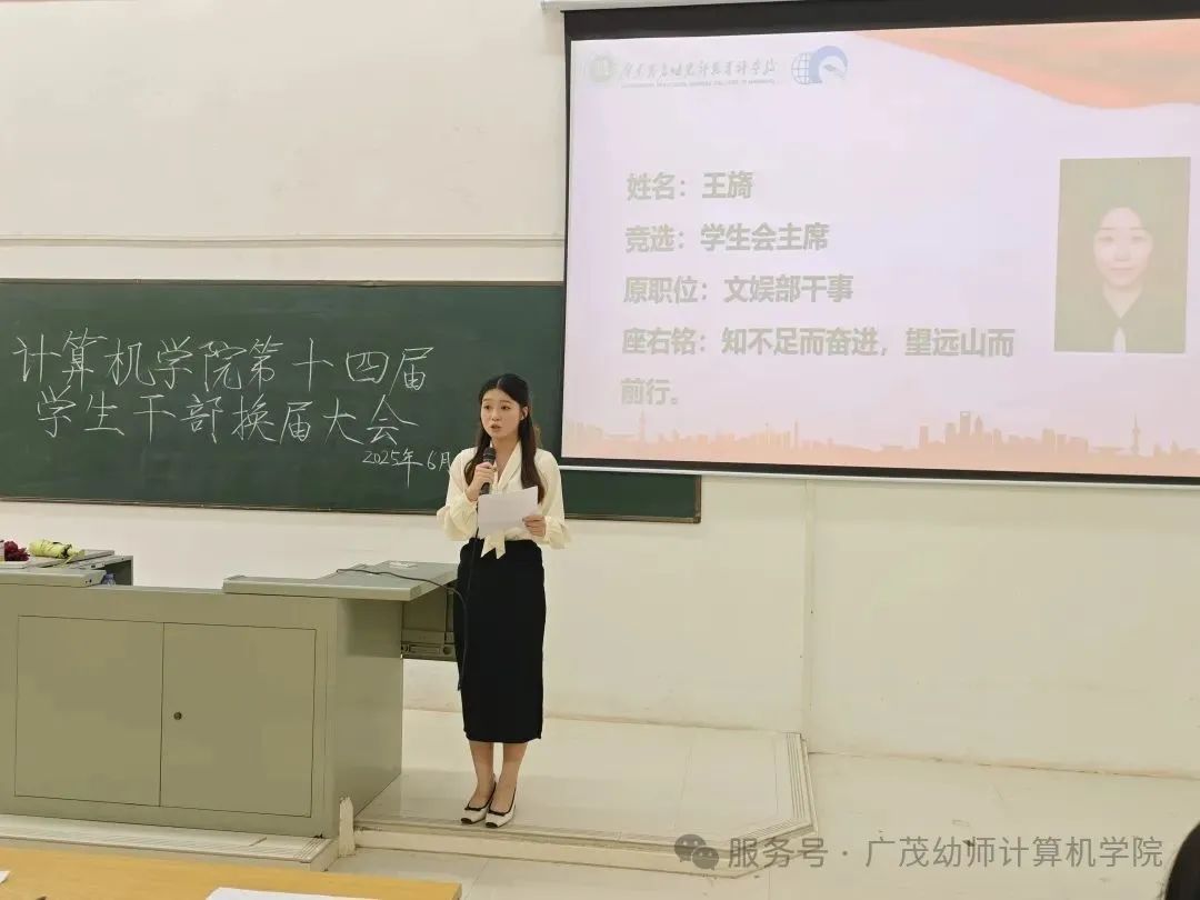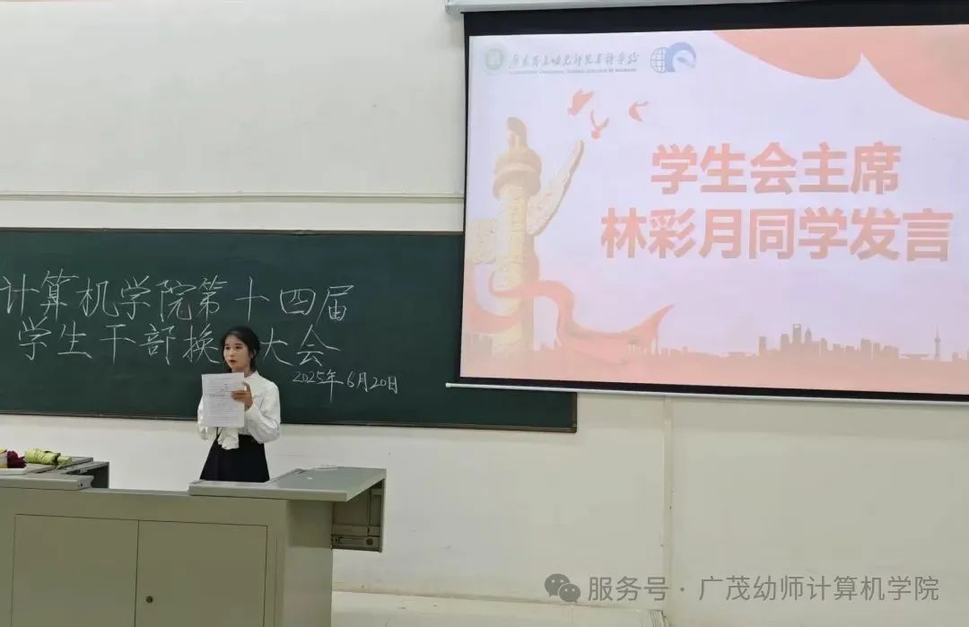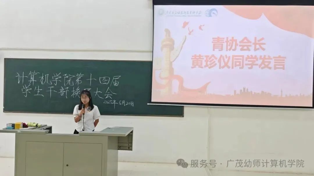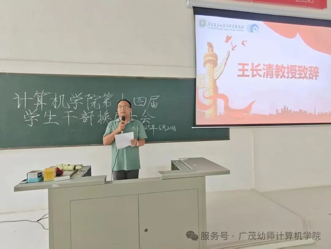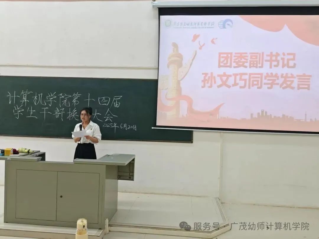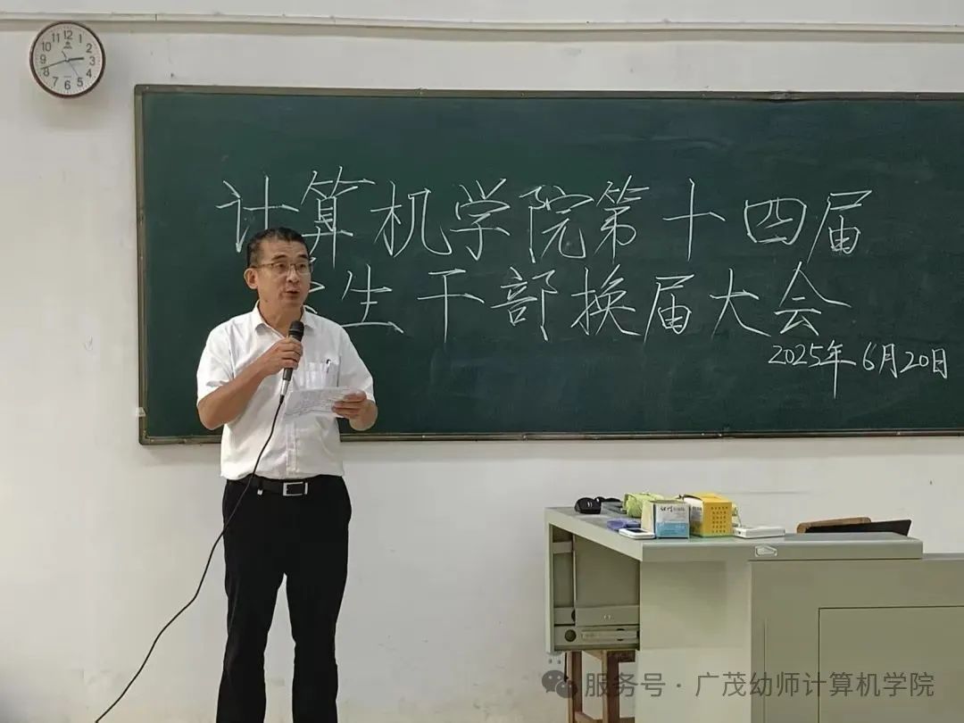 为进一步加强学生干部组织建设,选拔一批品学兼优、富有责任感的学生干部,2025年6月20日,计算机学院在慎取厅召开了第十四届团委、学生会、青协的换届大会。本次会议由324计网1班李威同学主持,计算机学院党总支书记黎家裕、副院长王长清、团委指导老师招雅丽、学生会指导老师张燕、青协指导老师李艳云以及全体学生干部和323、324级各班学生代表参加。